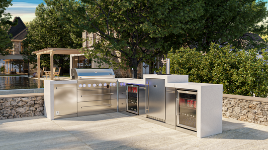 Mont Alpi 805 Deluxe BBQ Grill Island with 90 Degree Corner, Kegerator & Fridge Cabinet - MAi805-D90KEGFC