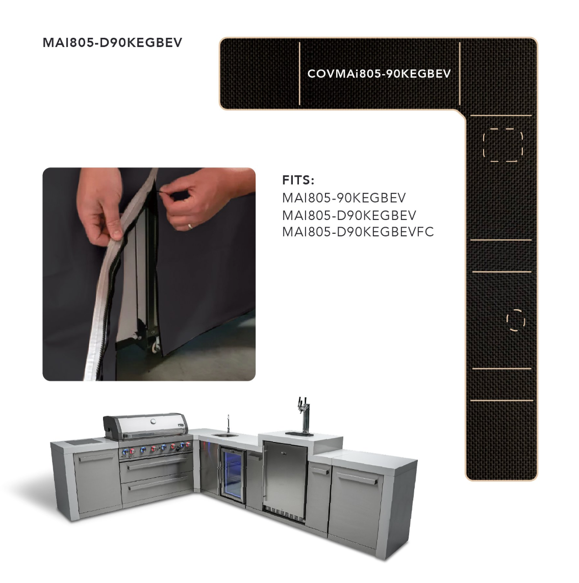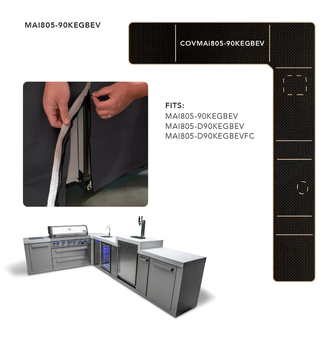 This durable all-weather cover for the Mont Alpi 805 Grill - Fits any 6-burner island with a 90-degree corner, kegerator and beverage center. It is designed with maximum durability in mind, protecting the stainless steel finish in all weather conditions and keeping your grill looking its best. Zipper closures allow any grill and module combination to be covered perfectly. Each module cover will zip to another in any combination.