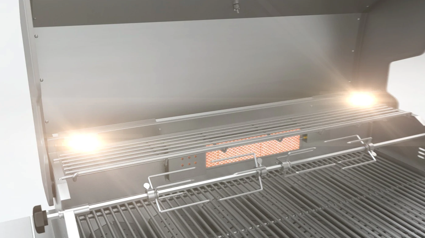 Experience easy cleaning and extra class with the waterfall granite which extends down the sides of the grill. The unit also includes a heavy-duty rotisserie kit, full-size weather cover, and a granite matching chopping board. With LED knob lights that change from blue when off to red when on and bright internal cooking lights, you'll have perfect vision and precision control. Plus, with the option to add useful accessories like the charcoal tray and griddle, you can take your grilling game to the next level.