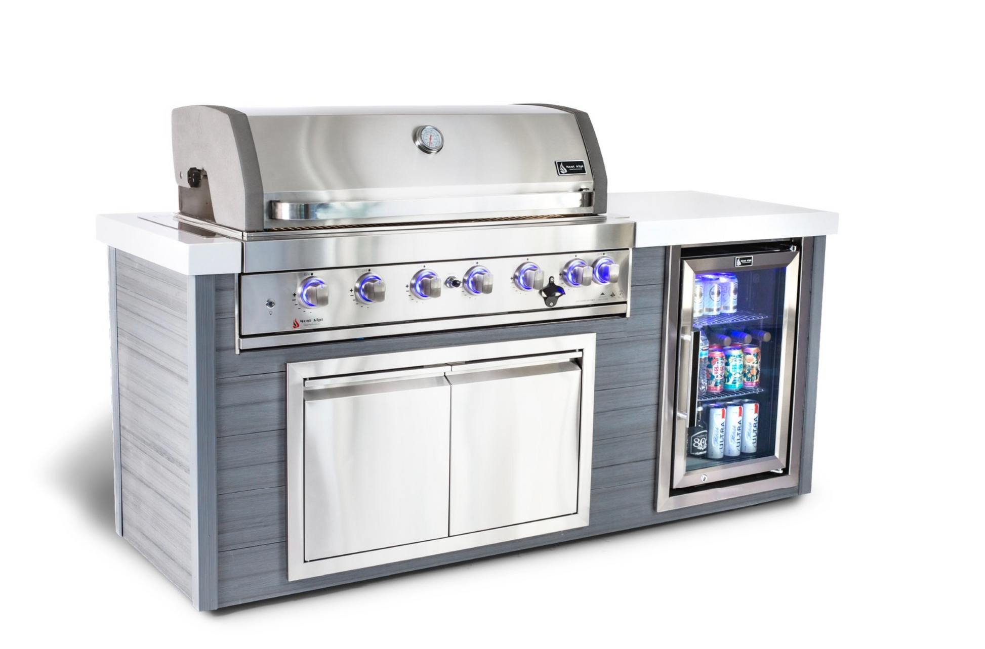 The stylish oversized white Granite-Composite Countertop compliments the sleek gray Artwood Island body. The cabinet with Stainless Steel double doors has room for a propane tank and more. The convenient Outdoor Rated Lockable Refrigerator cools the drinks while the counter offers ample space for food prep.