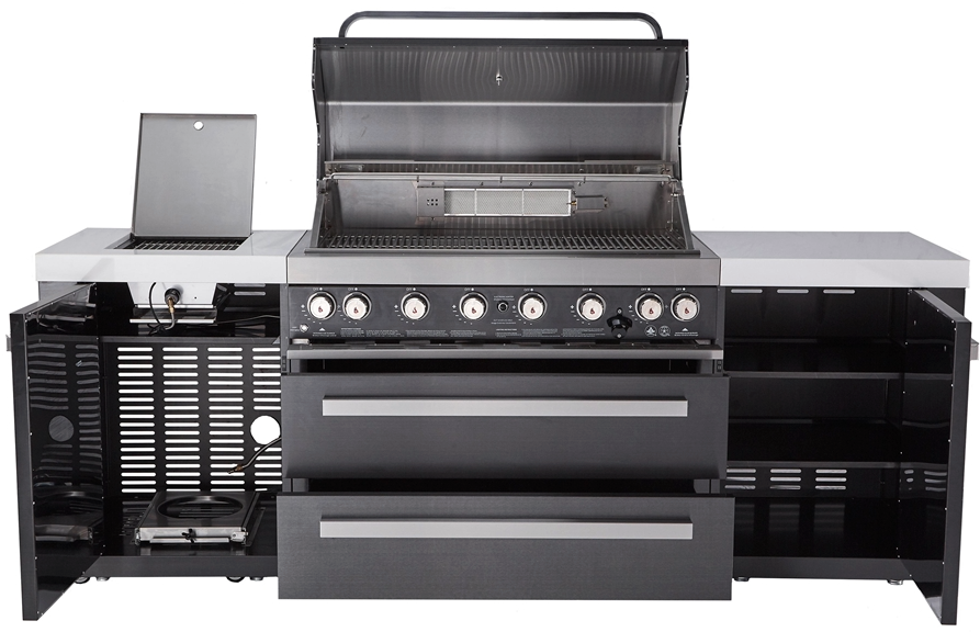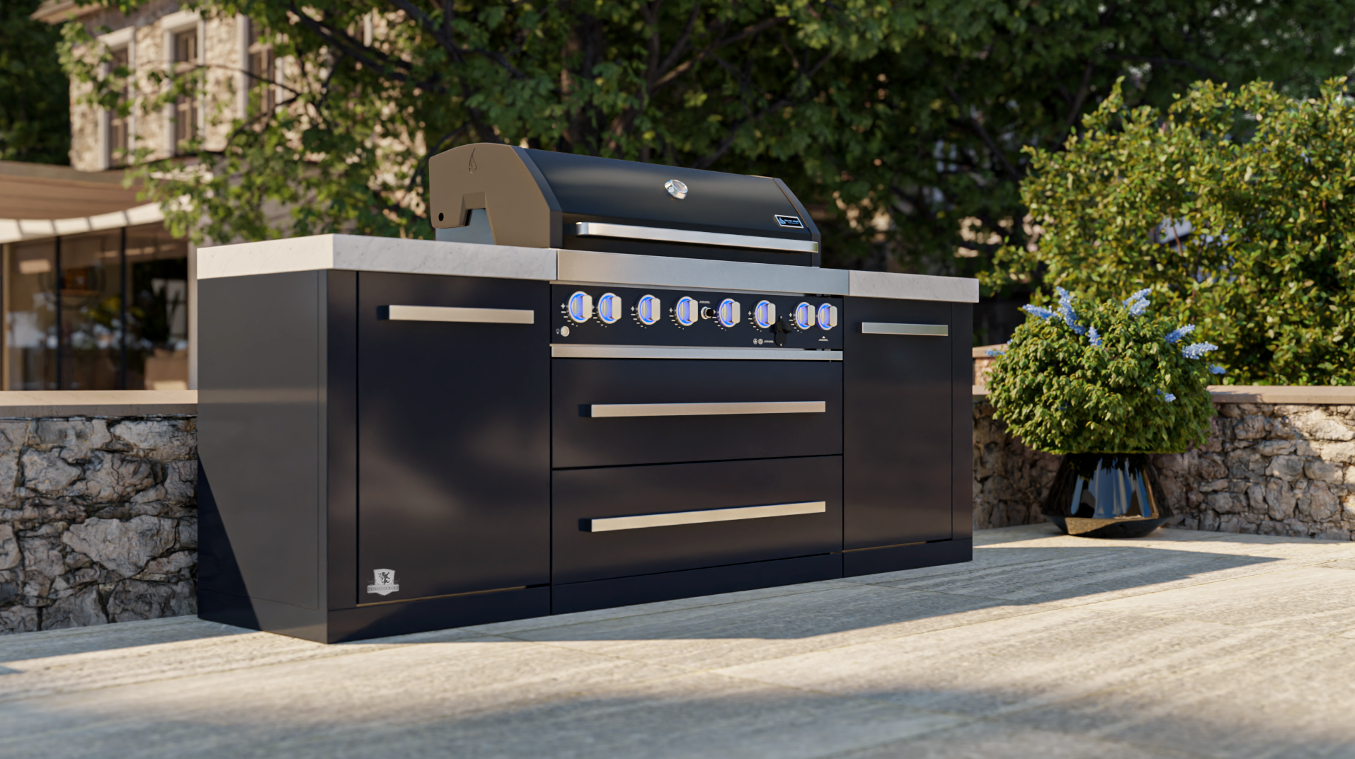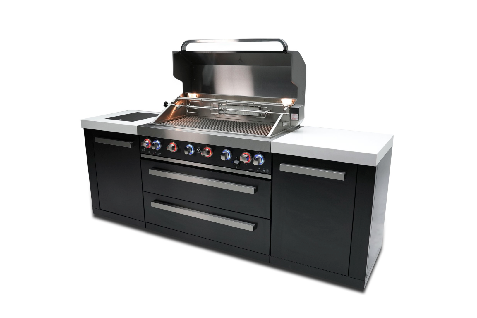 Upgrade your outdoor cooking game with the Mont Alpi Black Stainless Steel Island. This stunning grill combines the durability of stainless steel with the sleekness of black. It features six standard burners, an infrared side burner for searing and pan frying, and an infrared rear burner with a heavy-duty rotisserie kit for the ultimate rotisserie experience. The grill also includes LED knob lights and bright internal cooking lights, making it easy to grill with precision and control.