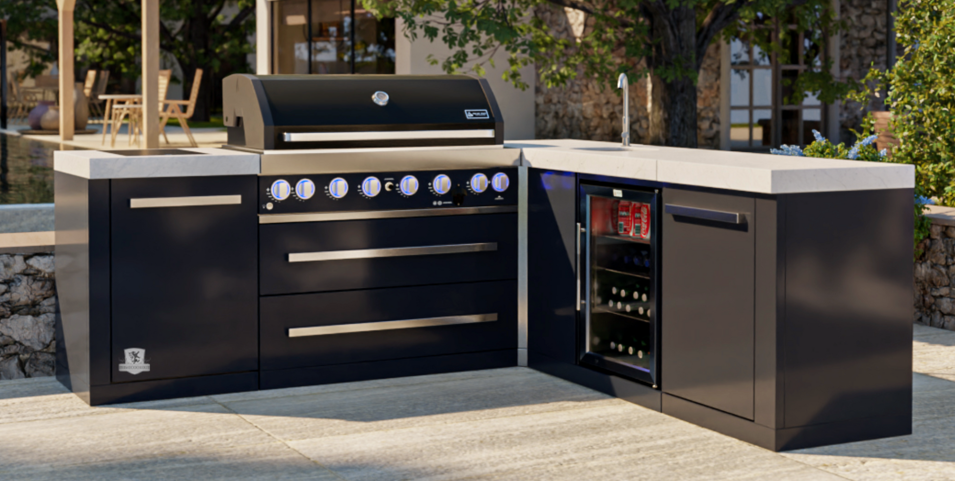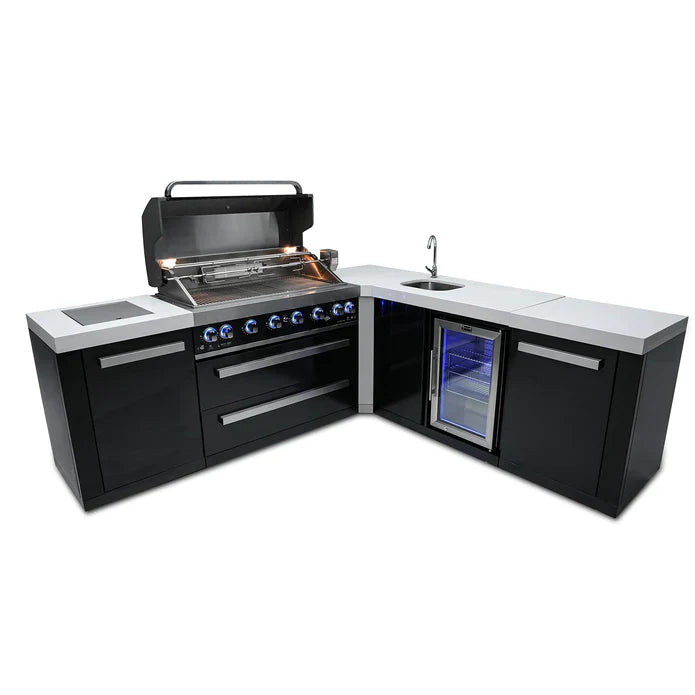 Upgrade your outdoor cooking and entertaining game with the Mont Alpi 805 Black Stainless Steel Island with a 90-degree corner and beverage center. This grill is the perfect combination of style, functionality, and durability. Crafted with a sleek black finish and stainless steel, it includes six standard burners, an infrared side burner, an infrared rear burner, and a heavy-duty rotisserie kit for the ultimate cooking experience.