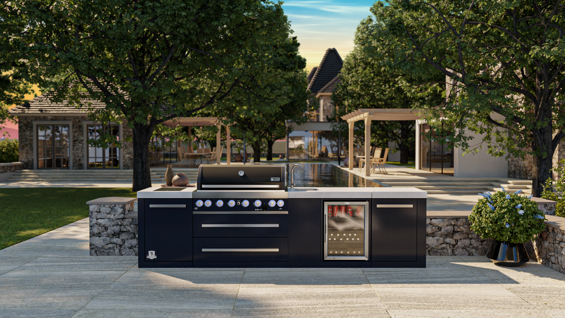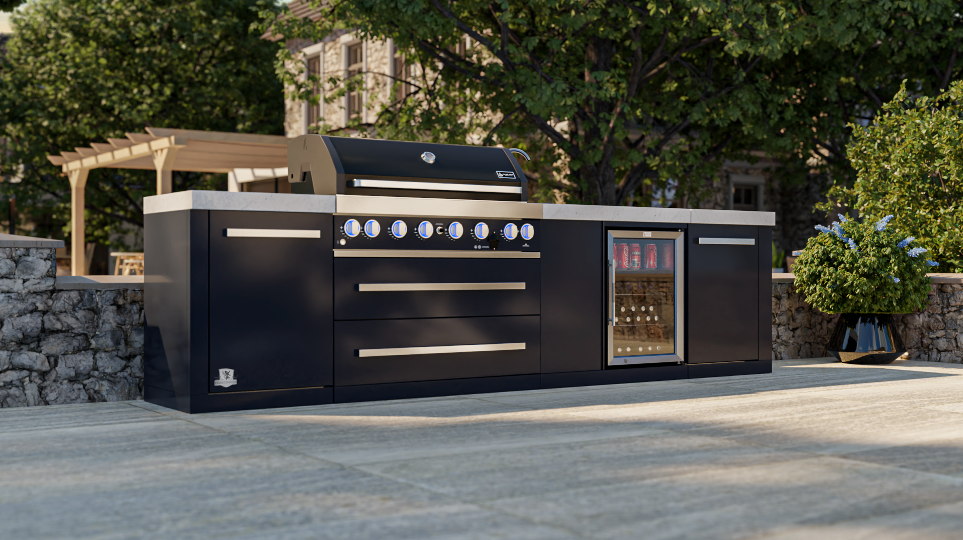 Elevate your outdoor cooking experience with the Mont Alpi 805 Black Stainless Steel Island with Beverage Center. This grill is the perfect combination of style and durability, with six standard burners, an infrared side burner, and an infrared rear burner complete with a heavy-duty rotisserie kit for the ultimate cooking experience. The LED knob lights and bright internal cooking lights offer precision control, while the counter granite top adds convenience and style.