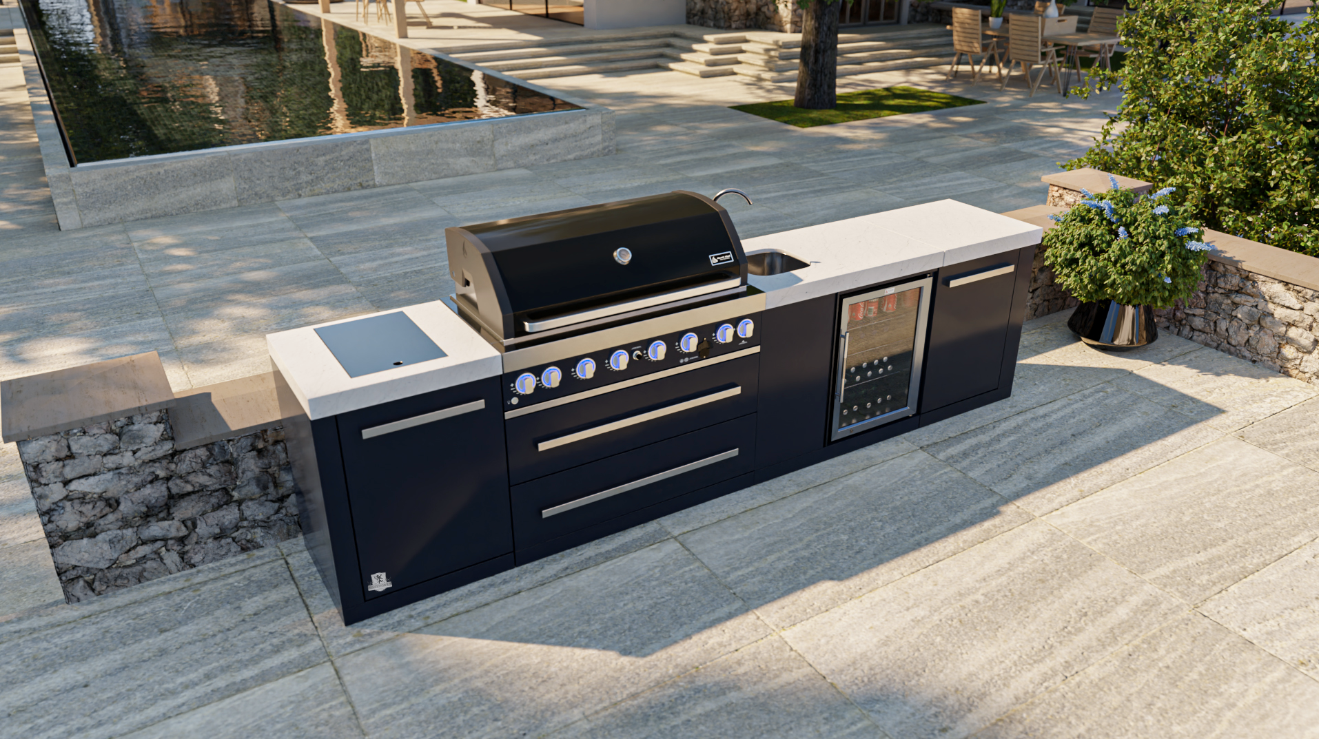 Elevate your outdoor cooking experience with the Mont Alpi 805 Black Stainless Steel Island with Beverage Center. This grill is the perfect combination of style and durability, with six standard burners, an infrared side burner, and an infrared rear burner complete with a heavy-duty rotisserie kit for the ultimate cooking experience. The LED knob lights and bright internal cooking lights offer precision control, while the counter granite top adds convenience and style.
