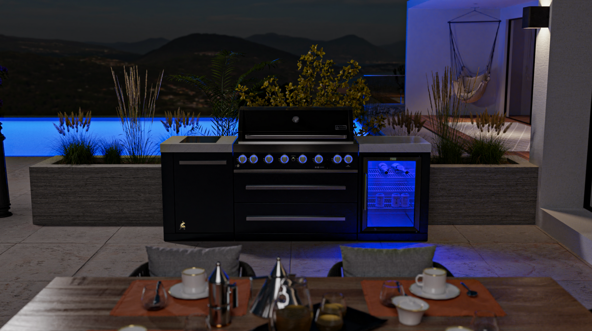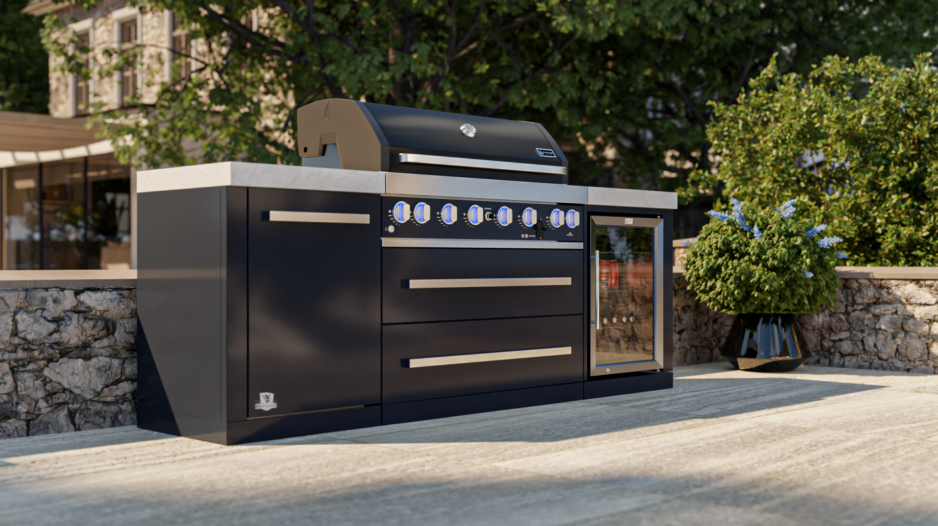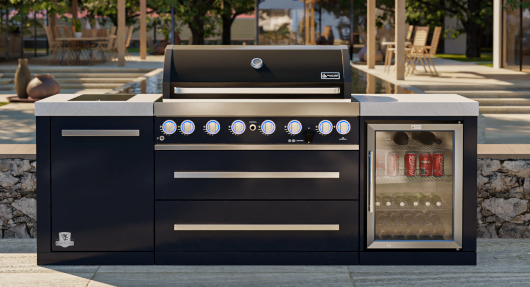 Elevate your outdoor cooking experience with the Mont Alpi 805 Black Stainless Steel Island with a Fridge Cabinet. This grill combines durability and style with six standard burners, an infrared side burner, and an infrared rear burner for the ultimate cooking experience. The outdoor-rated refrigerator is perfect for keeping your drinks and ingredients cold and at hand, while the LED lights and temperature control ensure precision control while grilling.