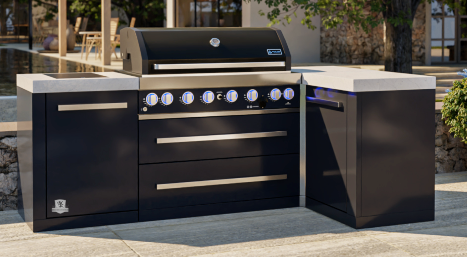 Upgrade your outdoor cooking game with the Mont Alpi 805 Black Stainless Steel Island with a 90-degree corner, the perfect combination of style, functionality, and durability.