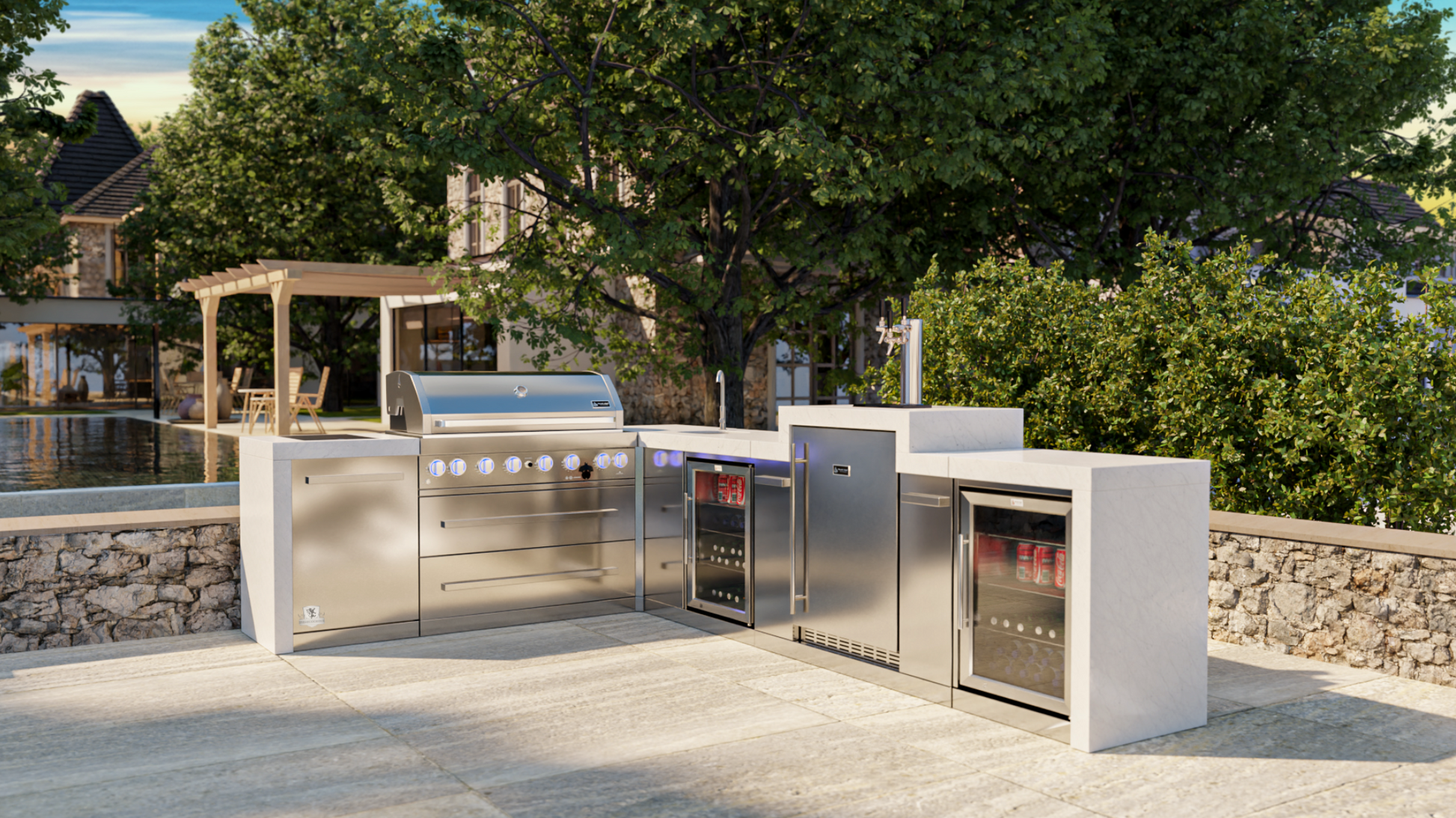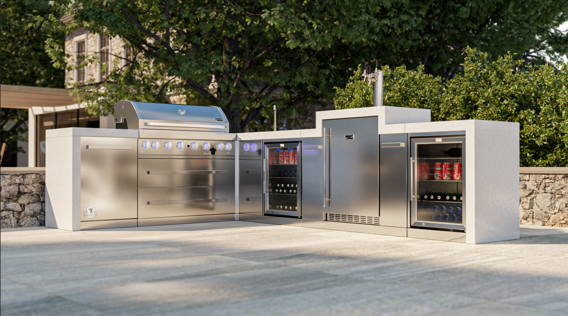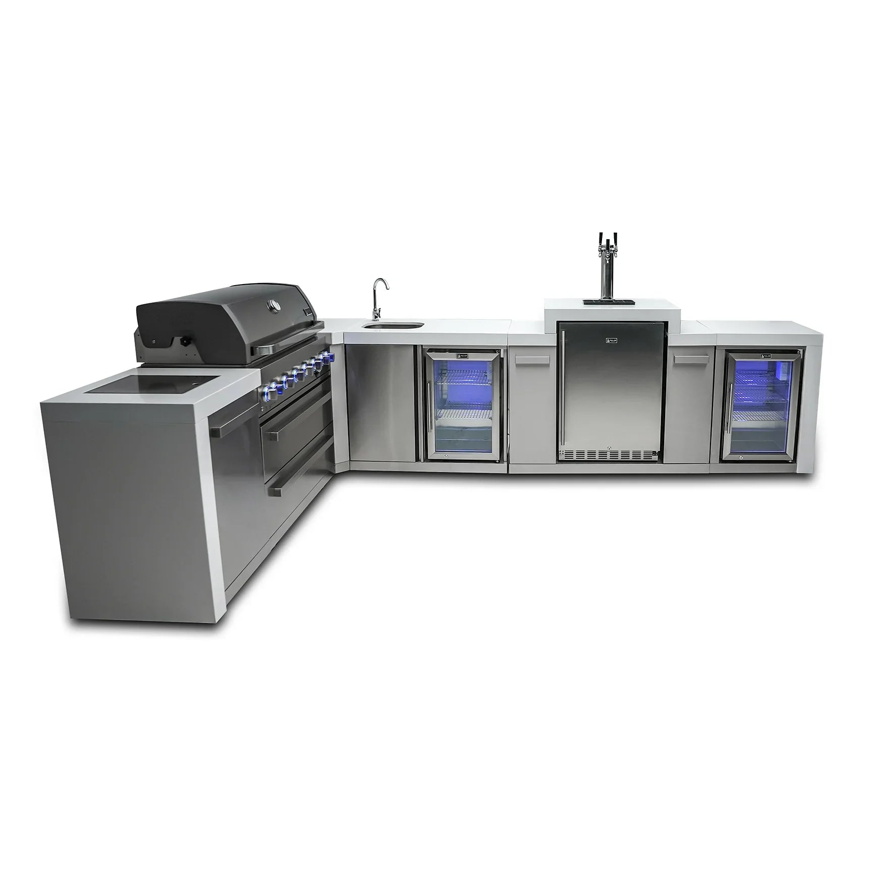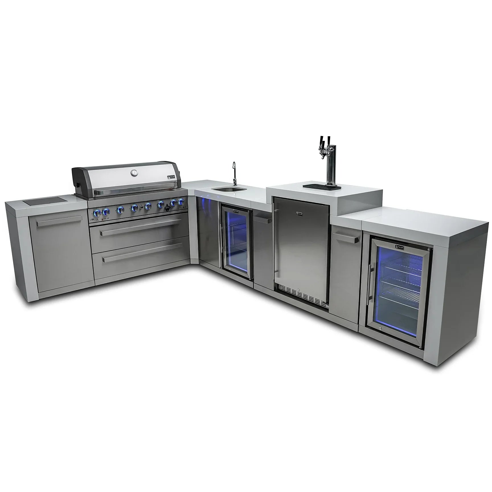 Mont Alpi 805 Deluxe BBQ Grill Island with 90 Degree Corner, Kegerator, Beverage Center & Fridge Cabinet - MAi805-D90KEGBEVFC