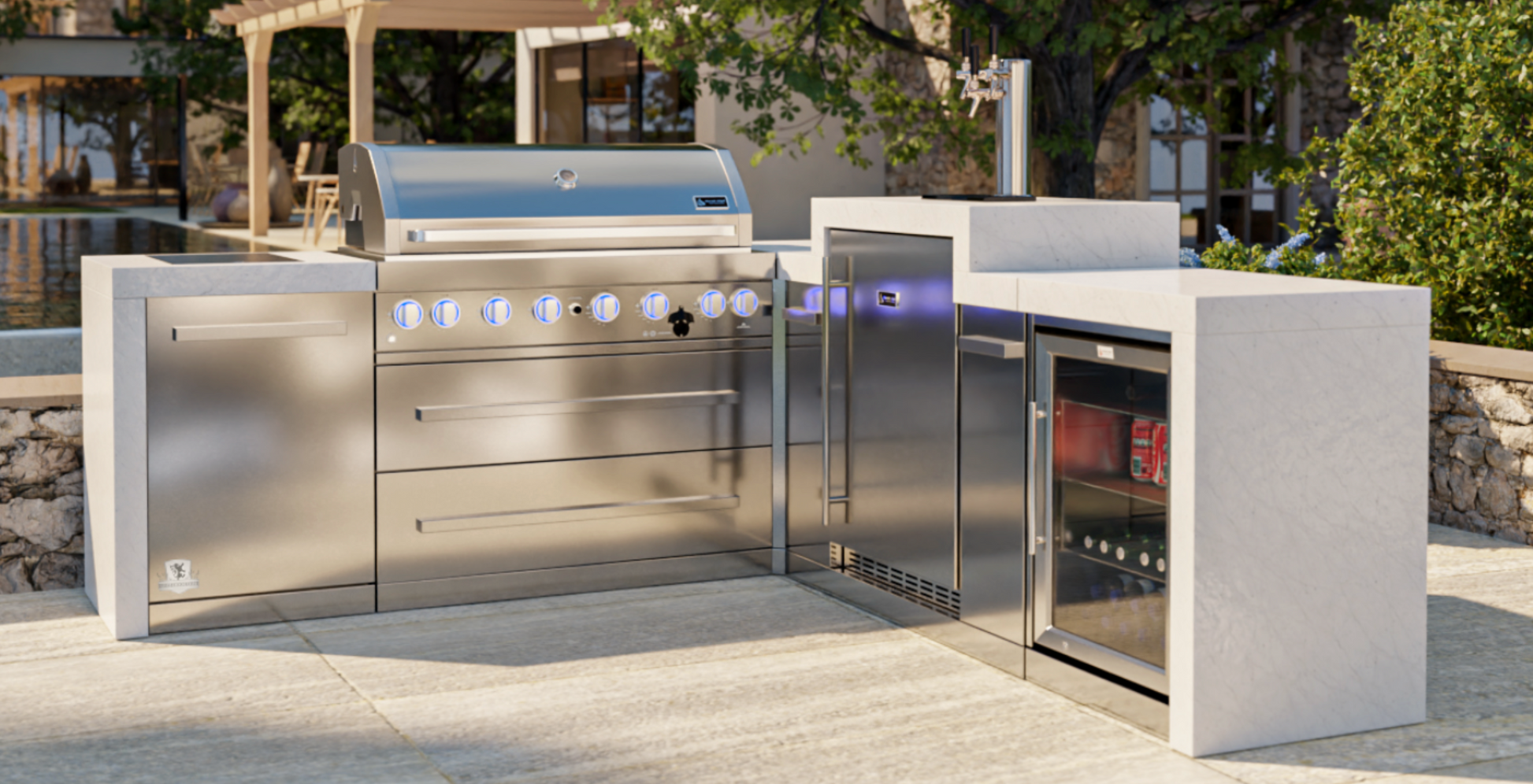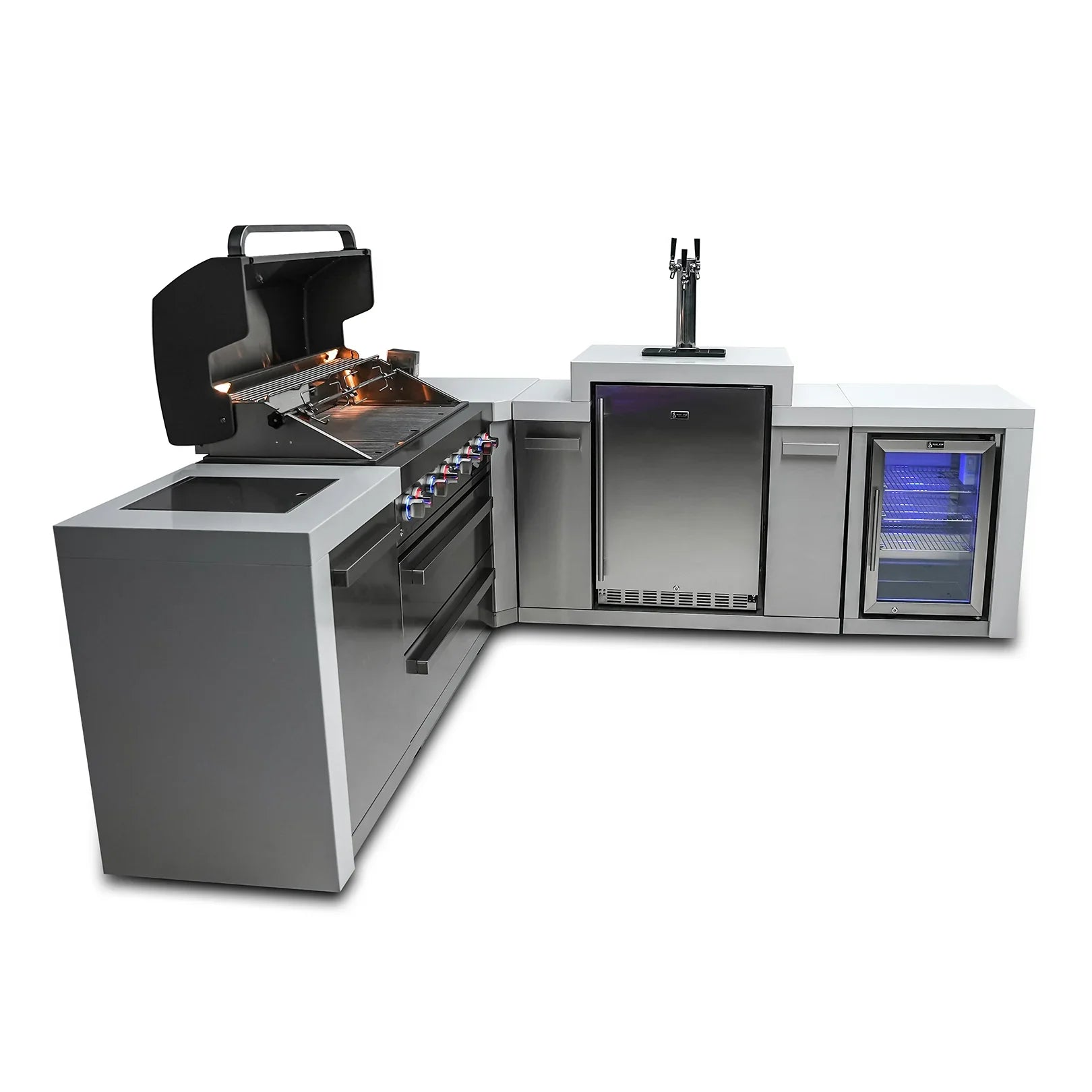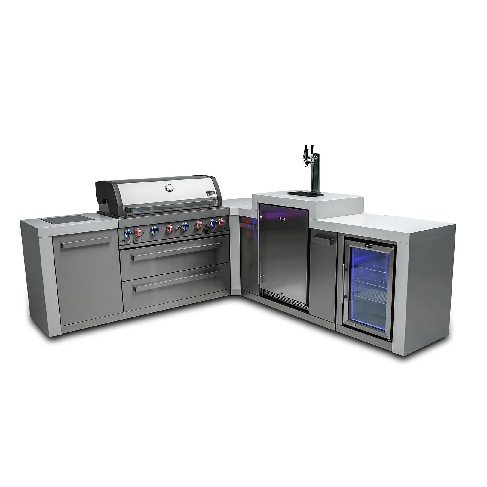 Mont Alpi 805 Deluxe BBQ Grill Island with 90 Degree Corner, Kegerator & Fridge Cabinet - MAi805-D90KEGFC