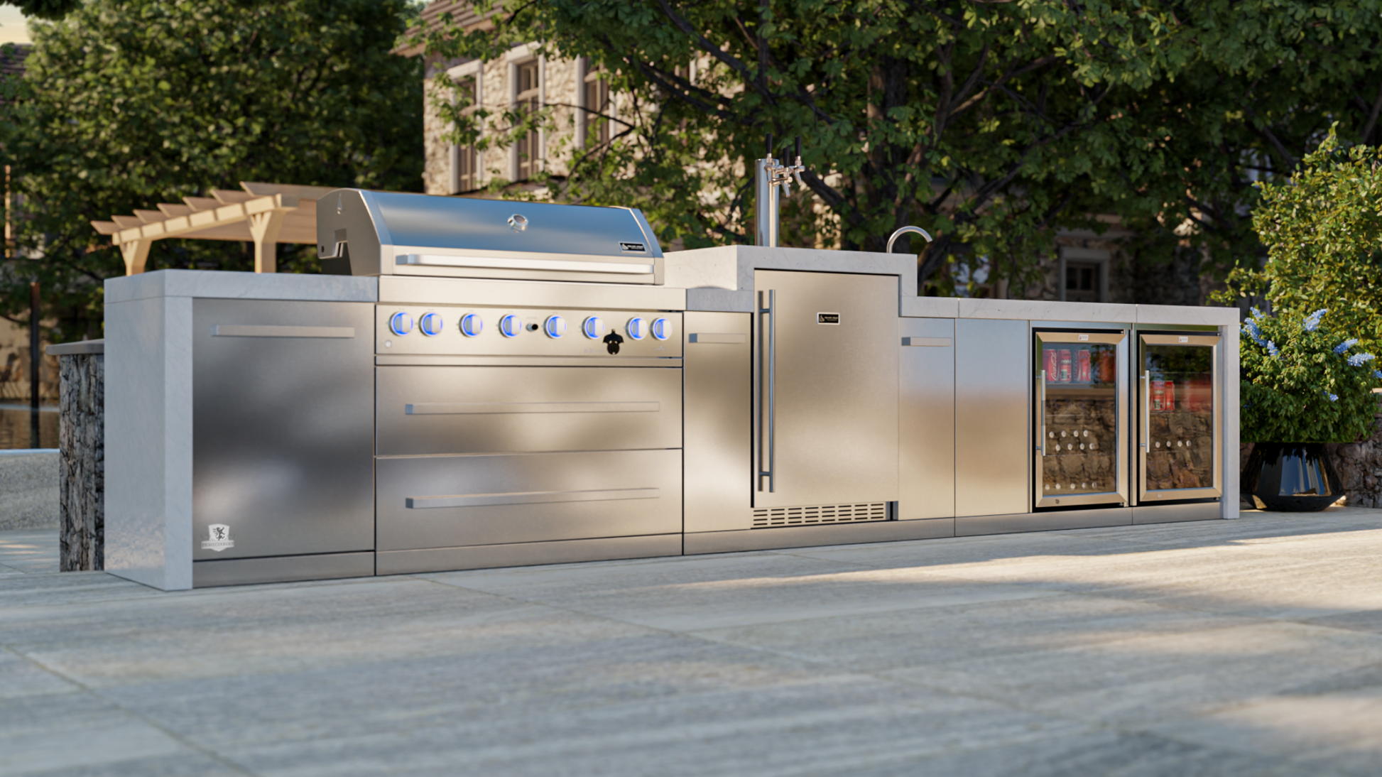 Mont Alpi 805 Deluxe BBQ Grill Island with Kegerator, Beverage Center & Fridge Cabinet - MAi805-DKEGBEVFC