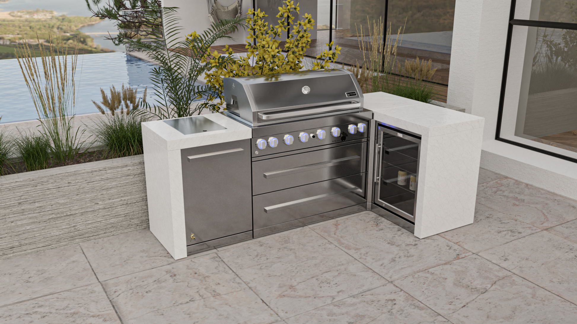 Get ready for the ultimate outdoor cooking experience with the Mont Alpi 6-burner Deluxe Island with a 90-degree corner and a fridge cabinet.