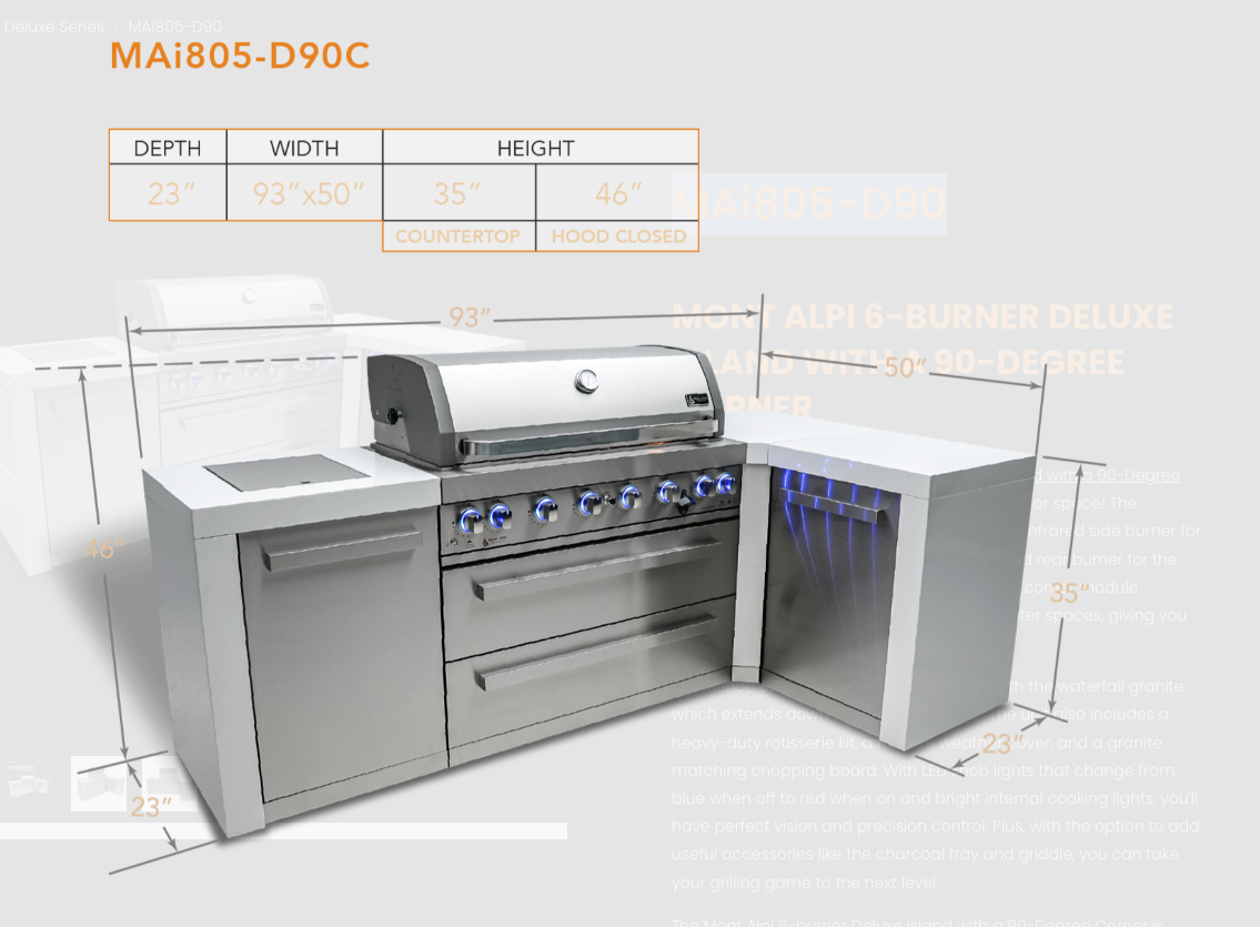 Introducing the Mont Alpi 6-burner Deluxe Island with a 90-Degree Corner - the ultimate deluxe grill for your outdoor space! The MAi805-D90 boasts six burners, along with an infrared side burner for searing, pan frying and boiling, and an infrared rear burner for the ultimate rotisserie experience. The 90-degree corner module provides a perfect fit for right angles and tighter spaces, giving you extra prep space.