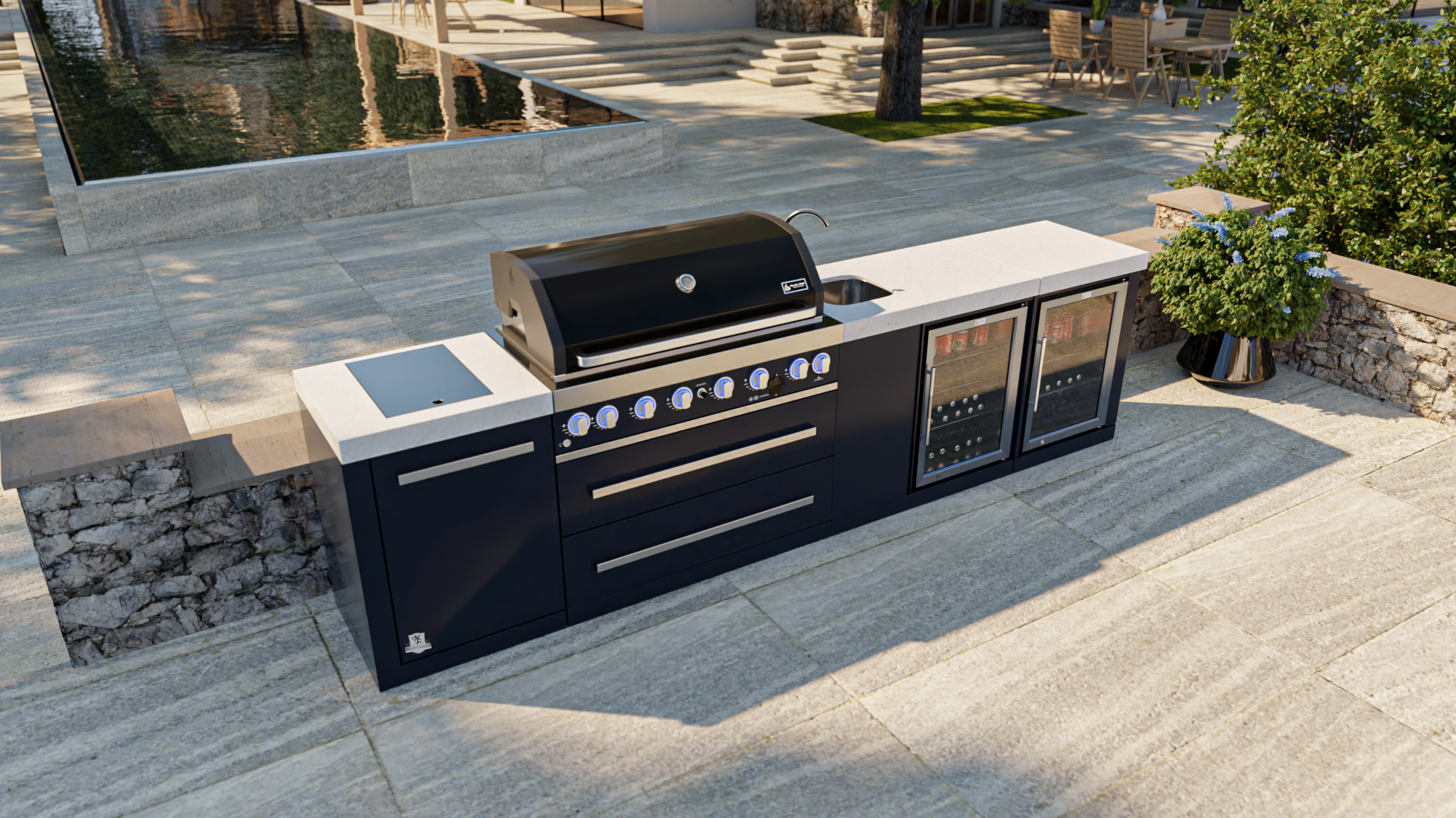 But that's not all, the beverage center and fridge module adds two beautiful outdoor-rated refrigerators and a well-appointed prep area with a sink and faucet. Keep your drinks and ingredients cold and at hand, and easily prep your meals with the convenient sink and faucet.