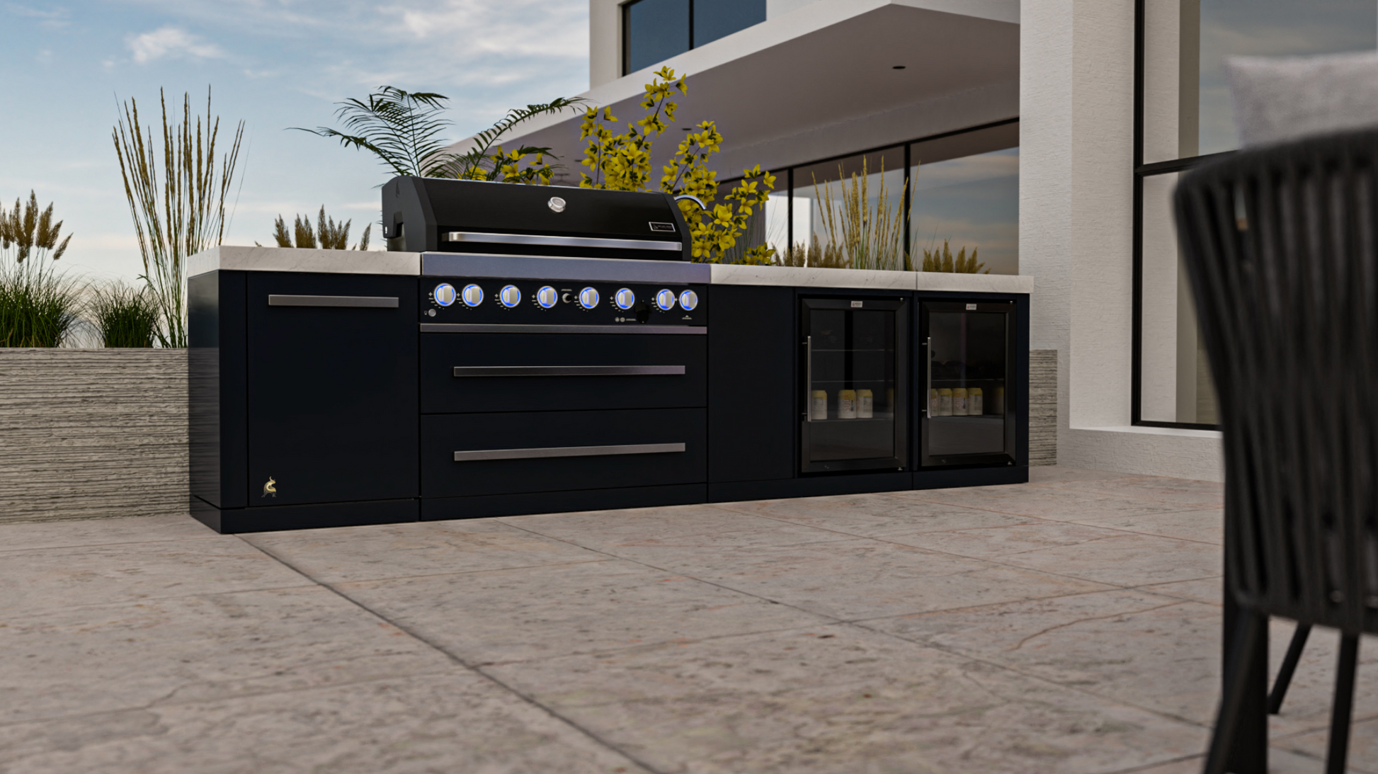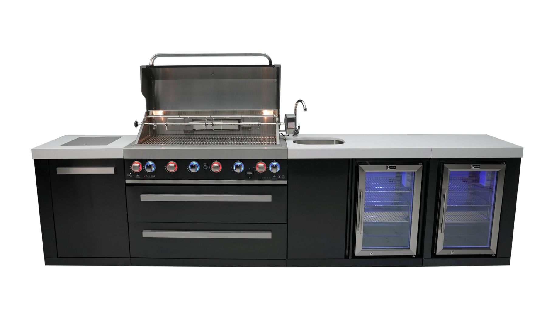Elevate your outdoor cooking experience with the Mont Alpi 805 Black Stainless Steel Island with a Beverage Center and Fridge Cabinet. This grill is the perfect combination of style and durability, with six standard burners, an infrared side burner, and an infrared rear burner complete with a heavy-duty rotisserie kit for the ultimate cooking experience. The LED knob lights and bright internal cooking lights offer precision control, while the countertop granite adds convenience and style.