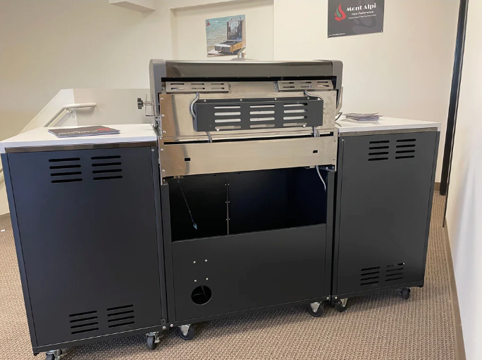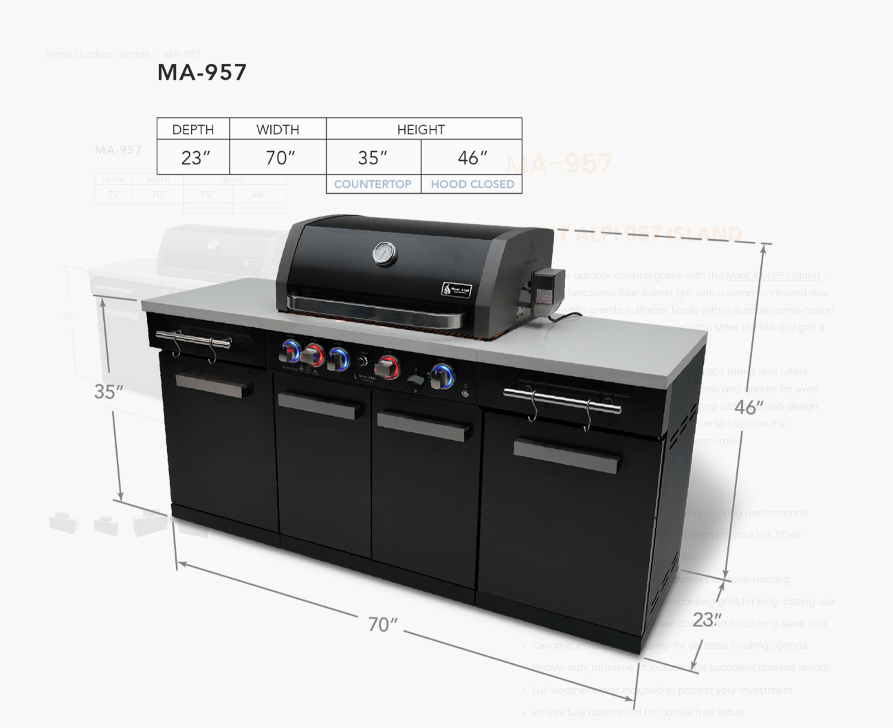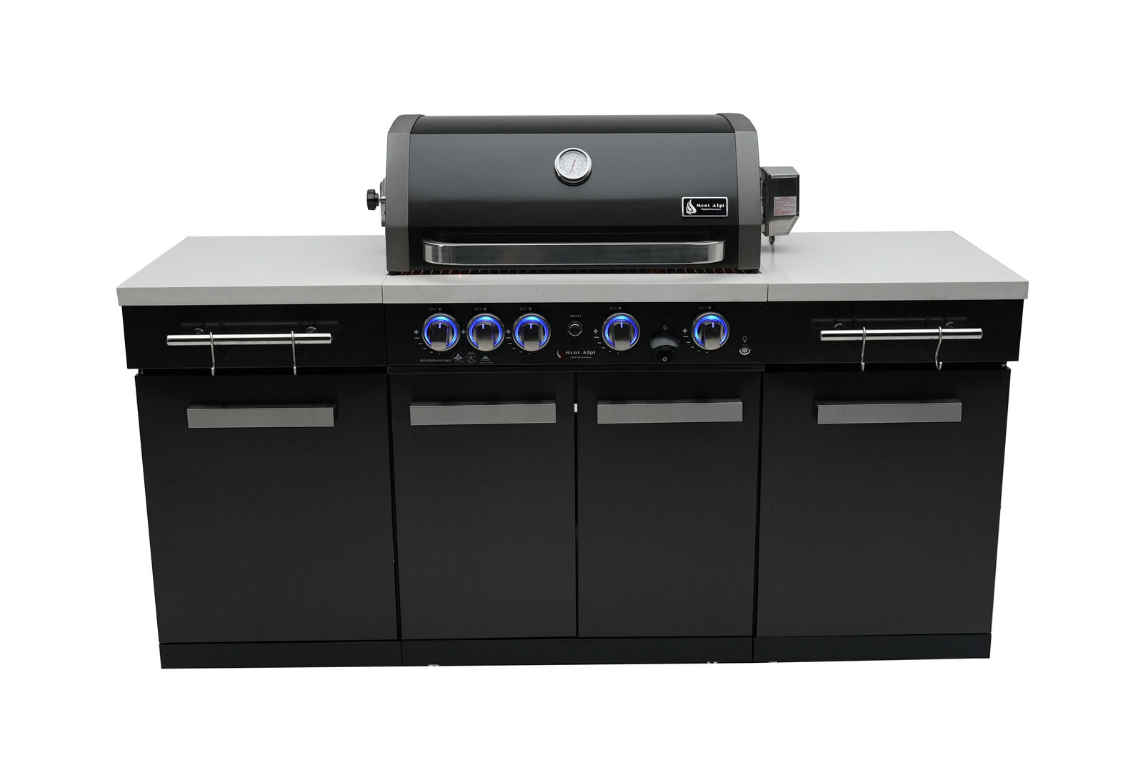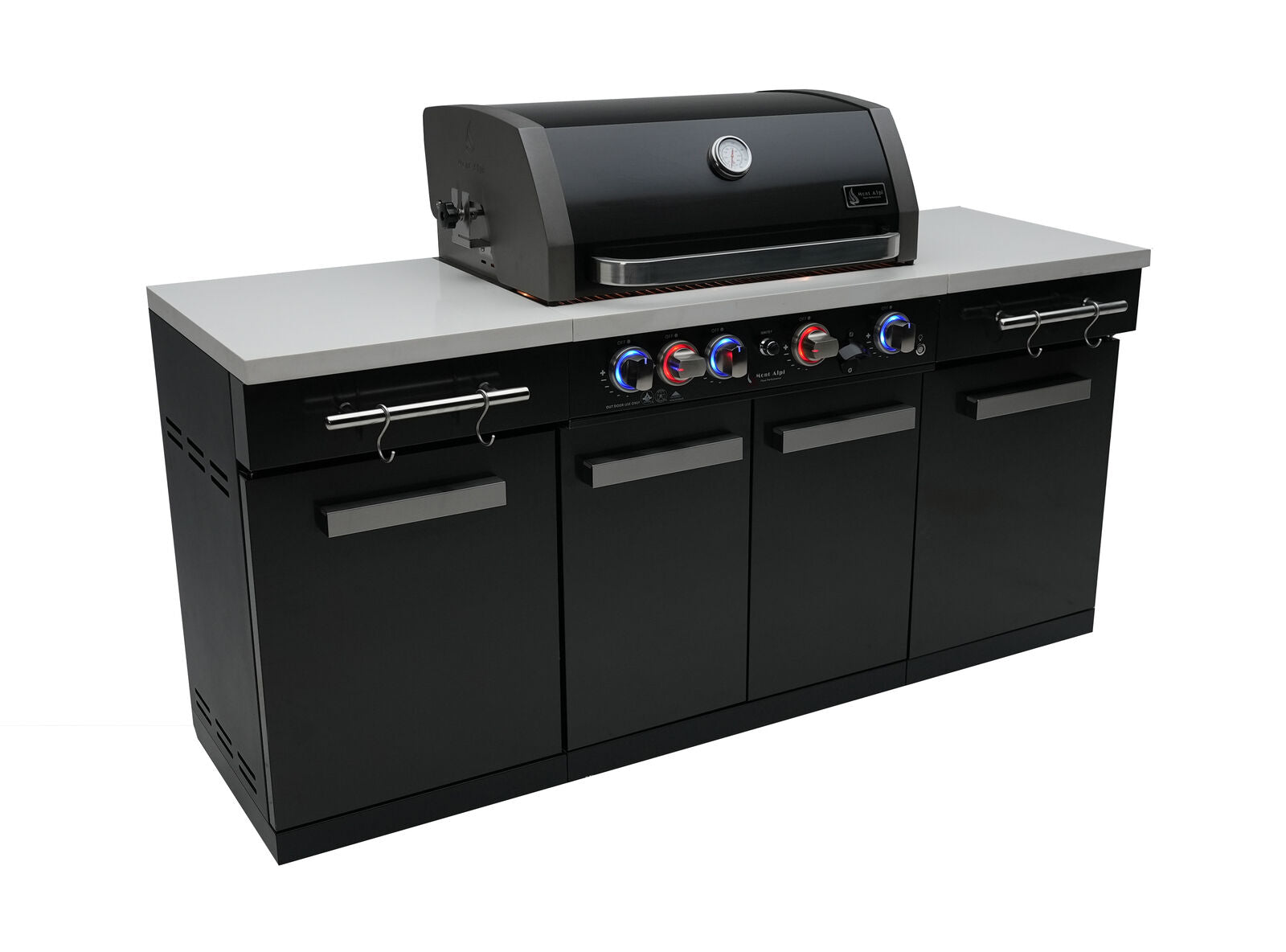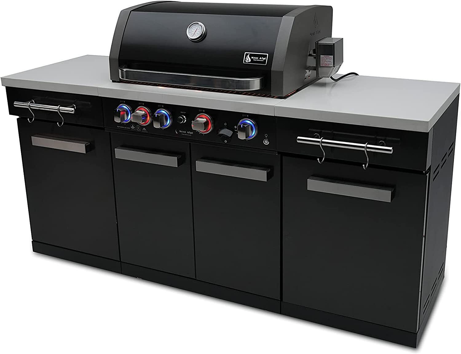 Upgrade your outdoor cooking game with the Mont Alpi 957 Island - a stylish and functional four-burner grill with a ceramic infrared rear burner and white granite surfaces. Made with a durable combination of stainless steel and black powder-coated steel, the MA-957 grill is sure to impress your guests.