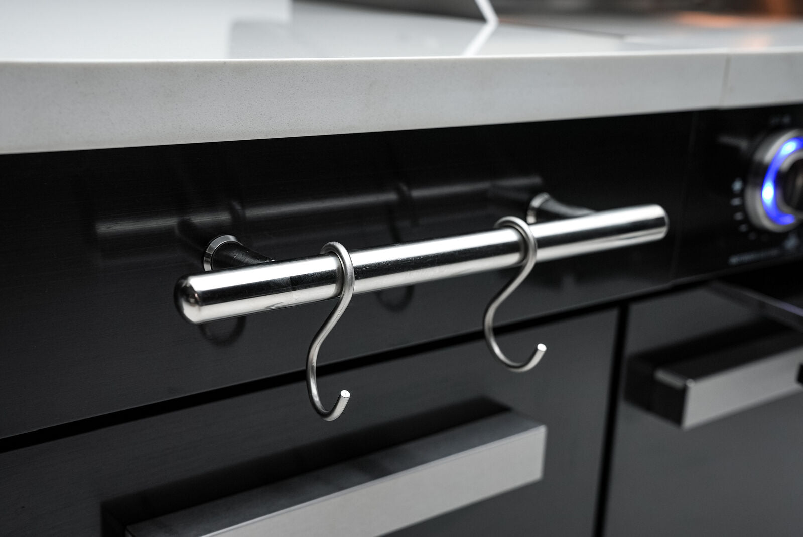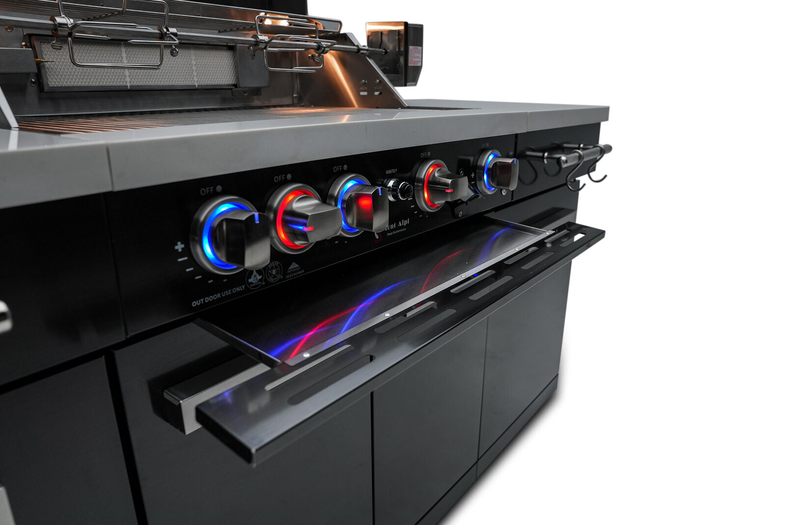 Control knobs with blue LED lights that turn red when the grill is on