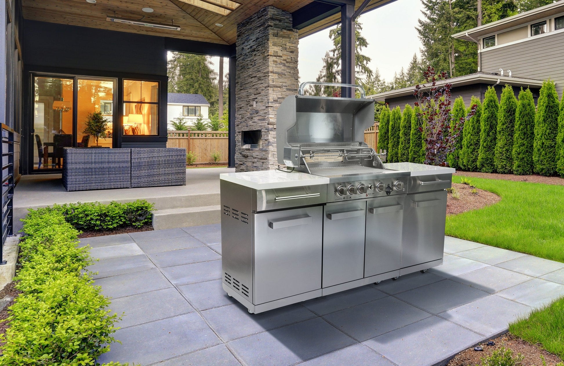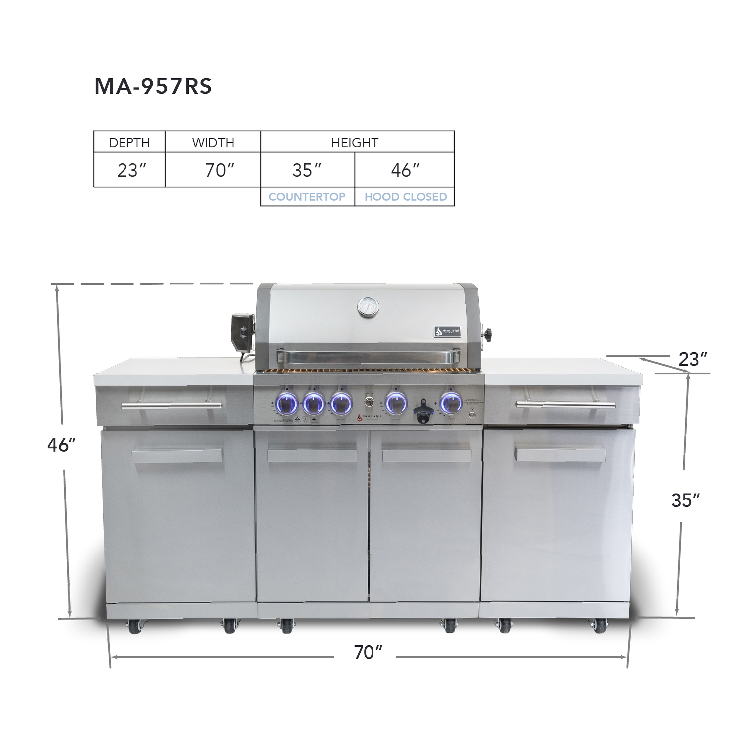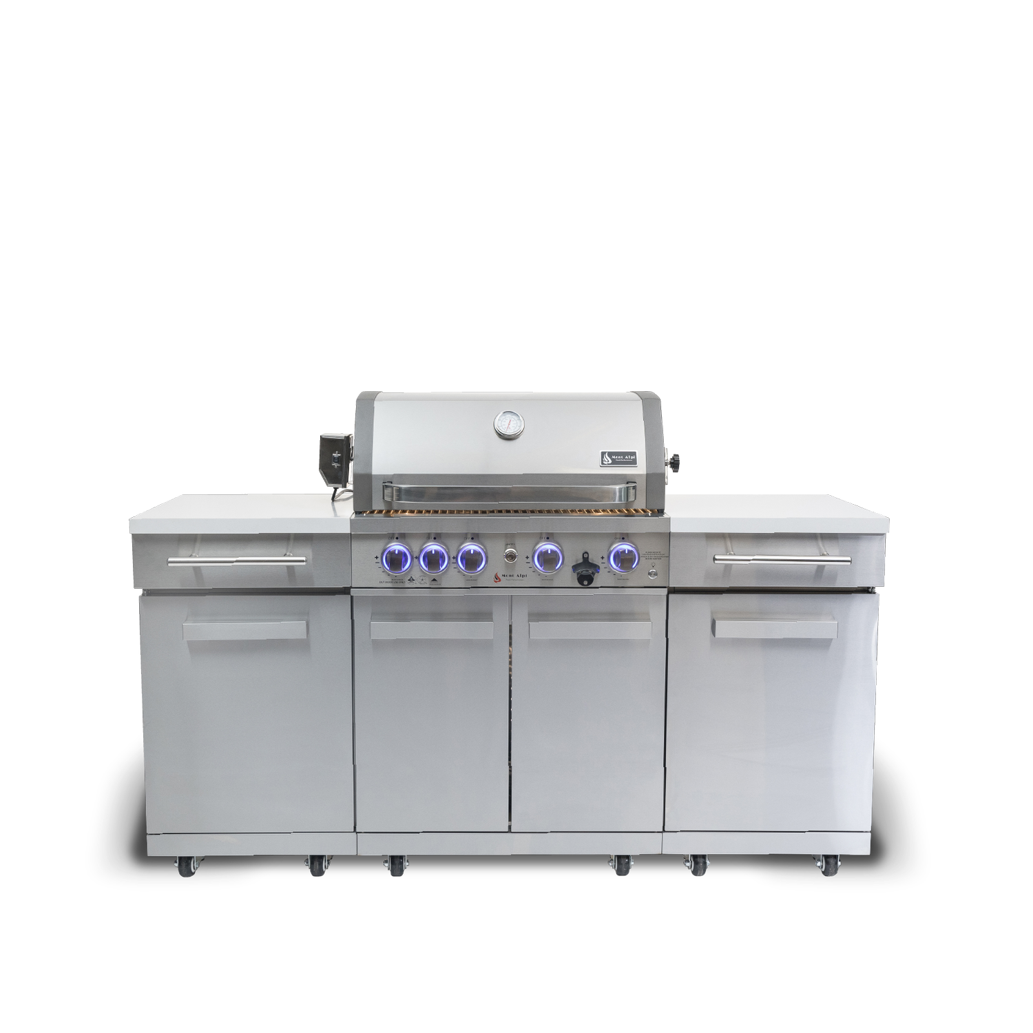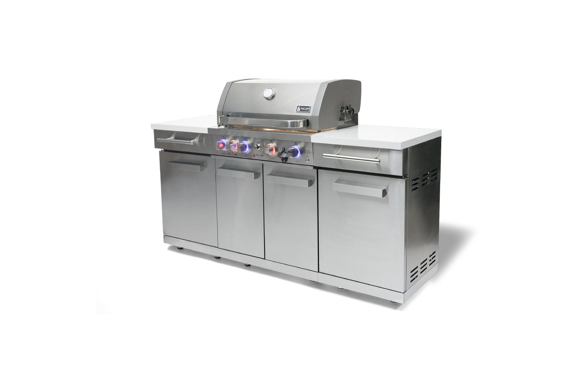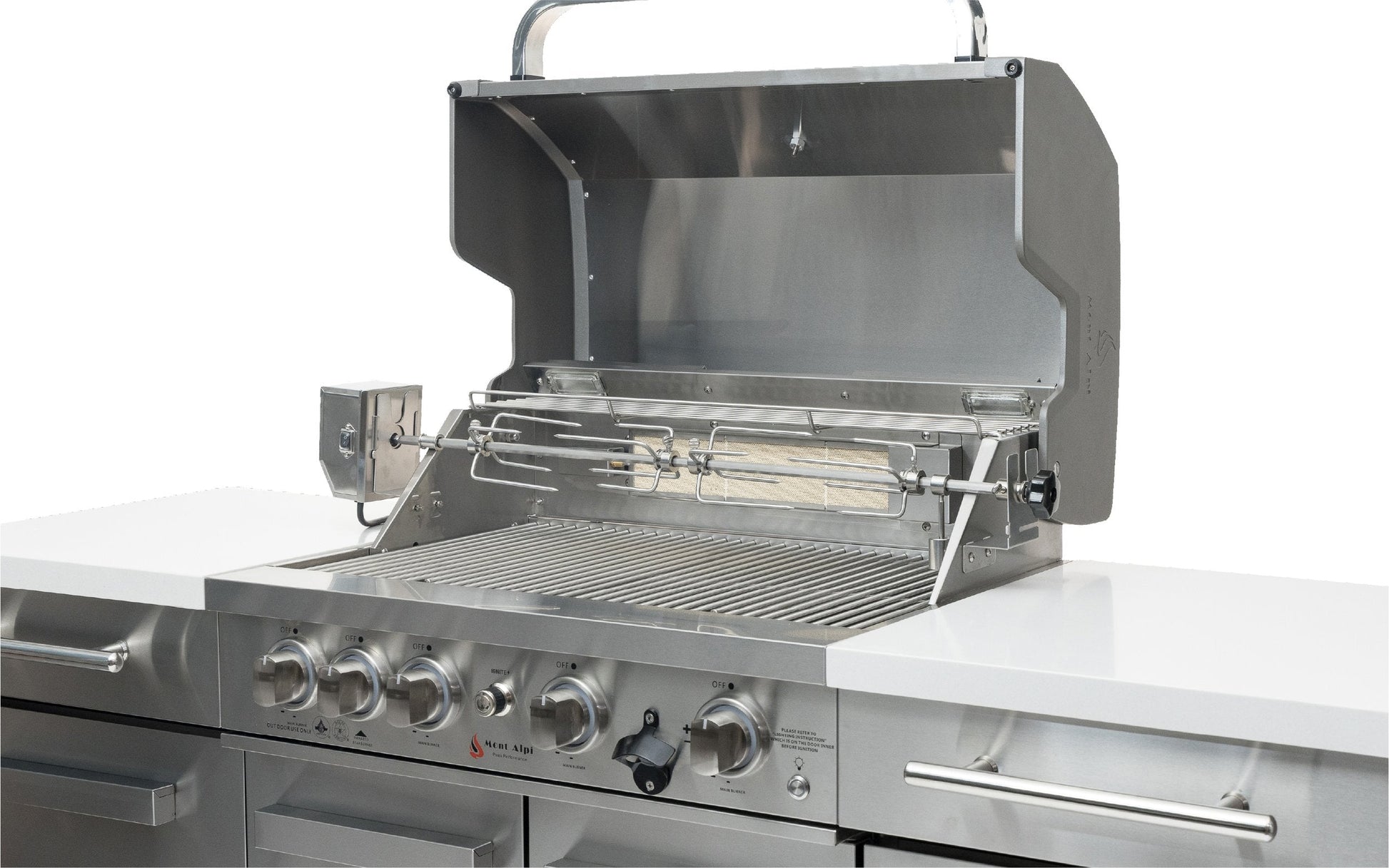 impress your guests with the Mont Alpi 957RS Island - a stylish and functional four-burner grill in regular stainless steel with a ceramic infrared rear burner and white granite surfaces. In addition to great features, the Mont Alpi 957RS Island also offers optional accessories such as a charcoal tray and griddle for even more versatility in your outdoor cooking. With its stylish design and impressive functionality, this grill is sure to become the centerpiece of your outdoor entertainment area.