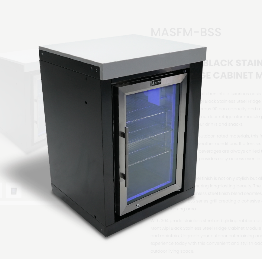 Transform your outdoor kitchen into a luxurious oasis with the expertly crafted Mont Alpi Black Stainless Steel Fridge Cabinet Module. Boasting a generous 90 can capacity and moveable 3 shelves, the MASFM-BSS outdoor refrigerator module provides ample storage space for all your drinks and snacks.