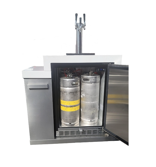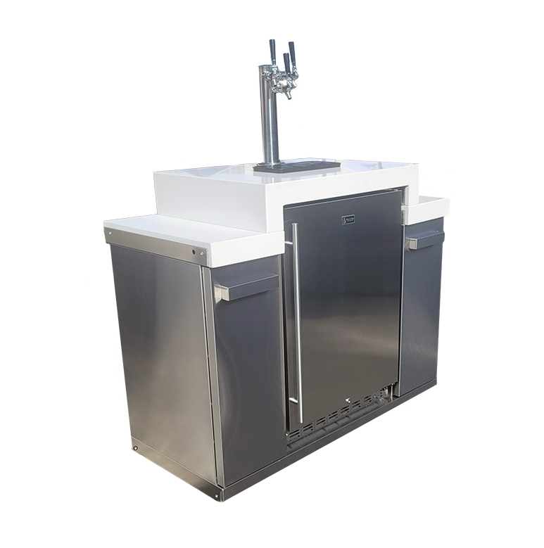 Mont Alpi Keg Center with outdoor rated cooler can hold 3 slim kegs. The unit has 3 taps and beautiful white granite surfaces. The Mont Alpi Keg Center is the perfect addition to an island or as a stand alone keg center.