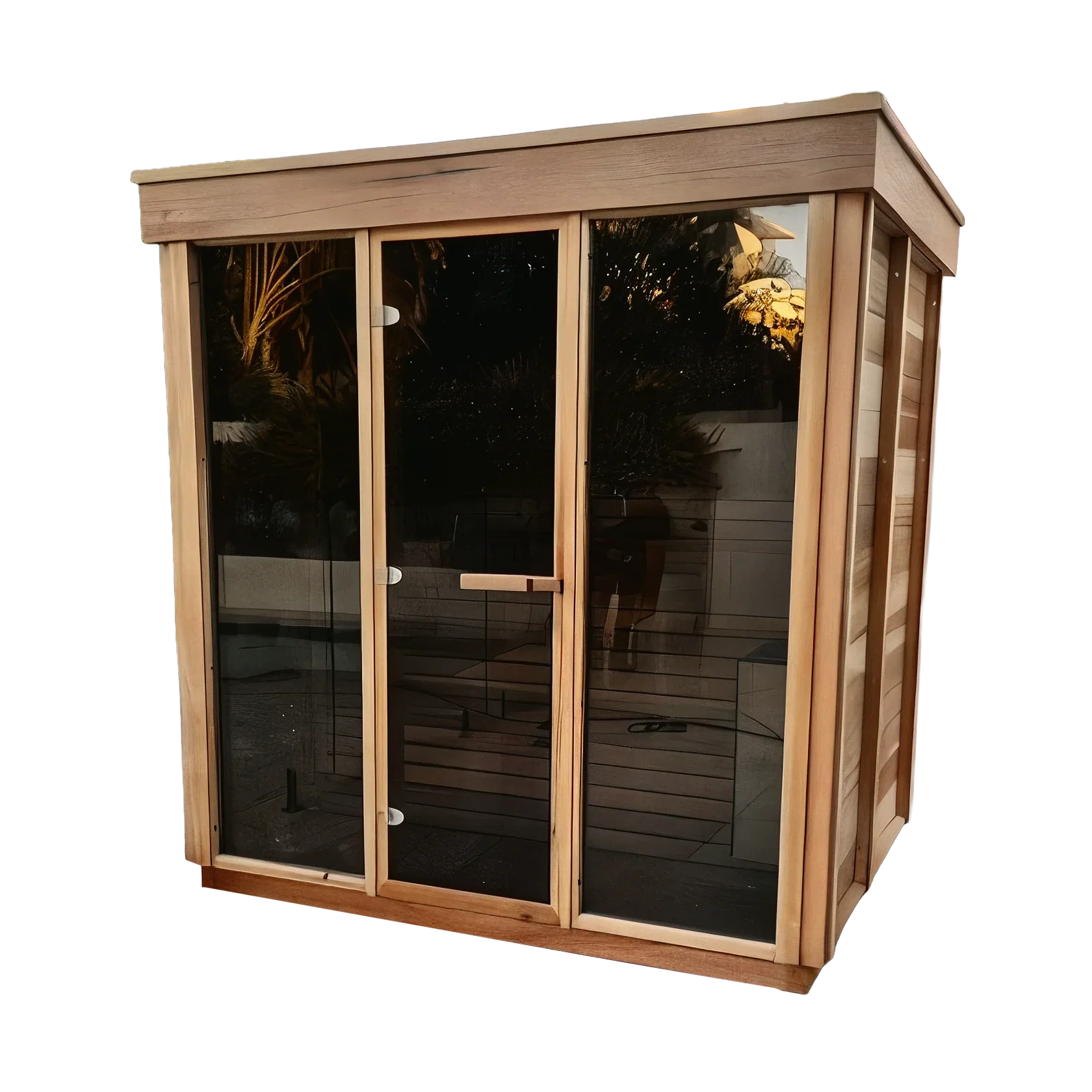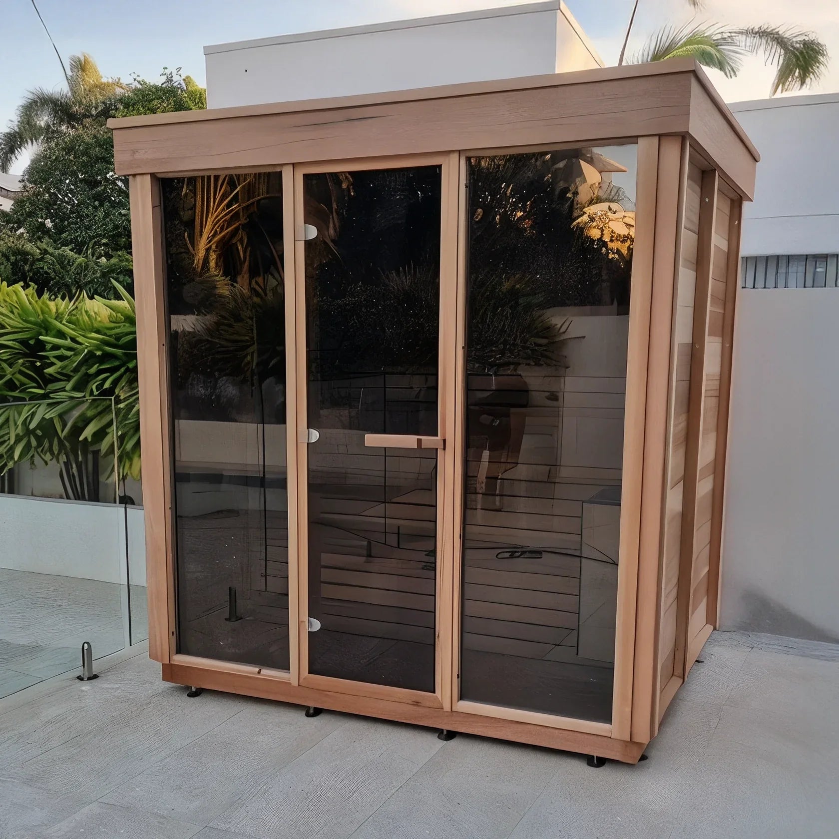 The Outdoor 570 Pure Cube Sauna is a stunning, contemporary design that combines luxury, comfort, and durability. Featuring a full glass door framed by large double-pane tempered glass windows on the front wall, this sauna creates a bright, open, and modern look. For those who prefer more seclusion, optional semi-privacy panels with cedar grills are available — offering privacy while still letting in natural light.