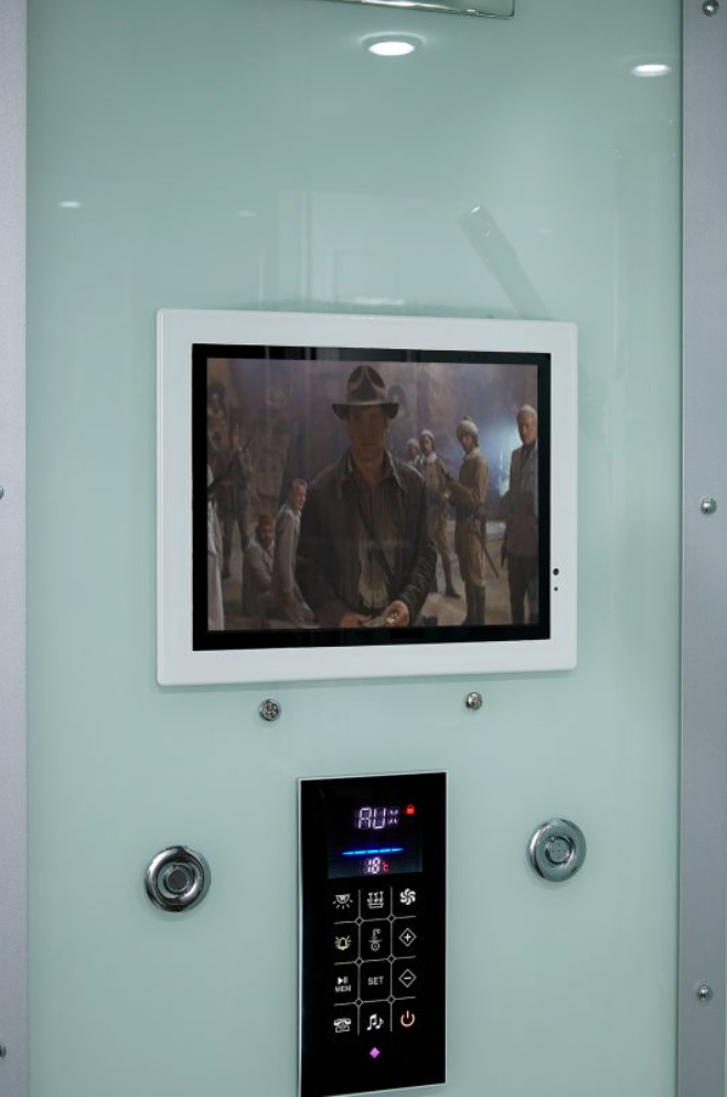 Finished with sleek white or black glass rear panelling and a clear glass front this striking steam enclosure design will be the highlight in any bathroom. This model combines all the health benefits associated with steam sessions along with a built-in Smart TV, bluetooth control panel, overhead spot lighting, rainfall shower, six recessed body jets, seating, shelving and thermostatic water control. The Anzio steam shower is designed with a compact footprint that lends itself to most bathrooms. Plus 10 Year Warranty!