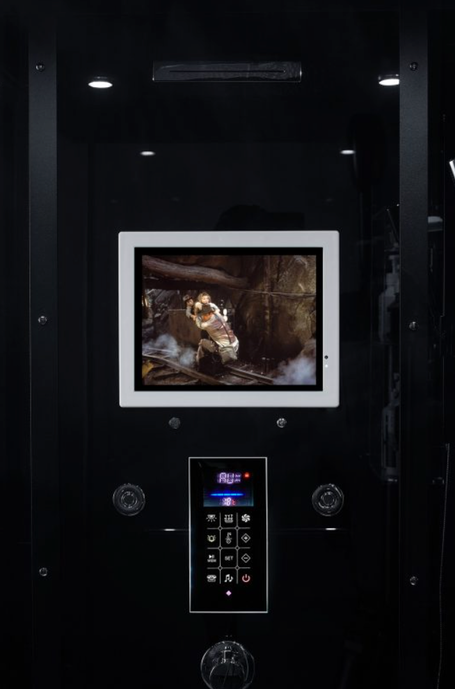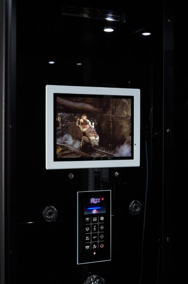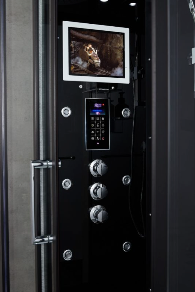 Finished with sleek white or black glass rear panelling and a clear glass front this striking steam enclosure design will be the highlight in any bathroom. This model combines all the health benefits associated with steam sessions along with an built-in Smart TV, bluetooth control panel, overhead spot lighting, rainfall shower, six recessed body jets, seating, shelving and thermostatic water control. The Lucca steam shower is designed with a compact footprint that lends itself to most bathrooms. Plus 10 Year Warranty!
