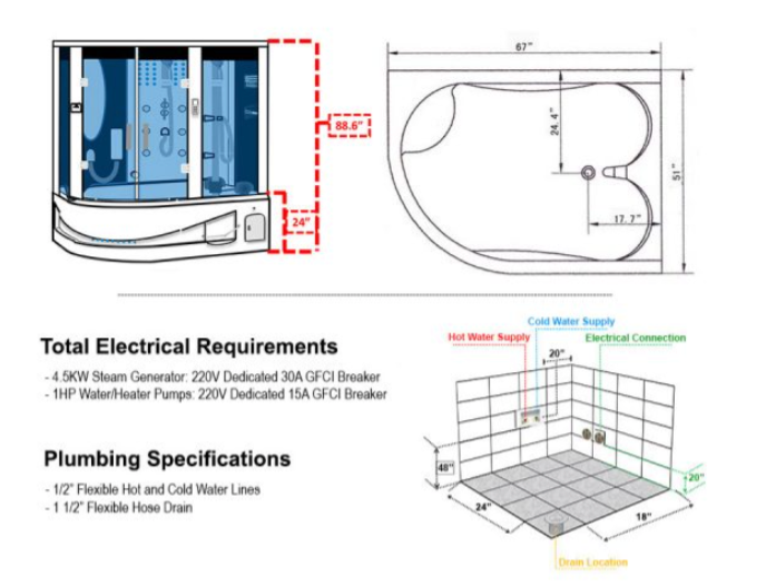The Siena computerized Steam Shower Massage Bathtub comes with a built in Heater Pump, 16 Whirlpool Massage Jets, 10 Accupuncture Massage Jets, Waterproof 8.4″ LCD TV, MP3 Compatible. Plus 10 Year Warranty