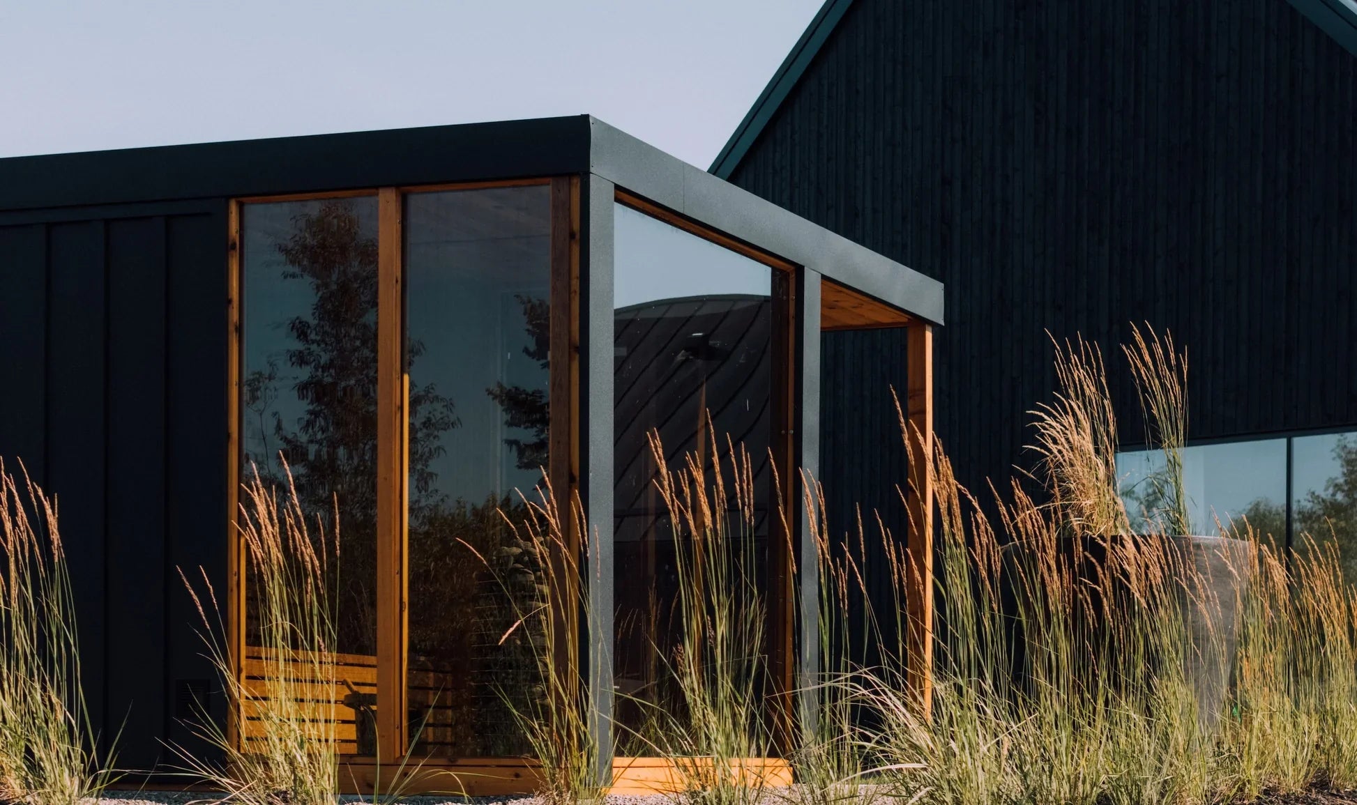 Durability: Weather-resistant EPDM roofing and sleek black standing seam-clad siding