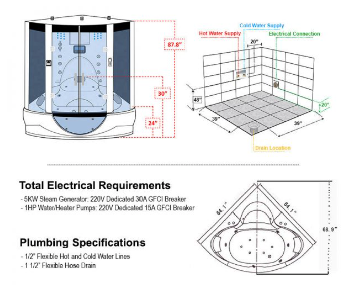 The Valencia computerized Steam Shower Massage Bathtub comes with a built in Heater Pump, 16 Whirlpool Massage Jets, 10 Acupuncture Massage Jets, Waterproof 8.4″ LCD TV, MP3 Compatible. Plus 10 Year Warranty!